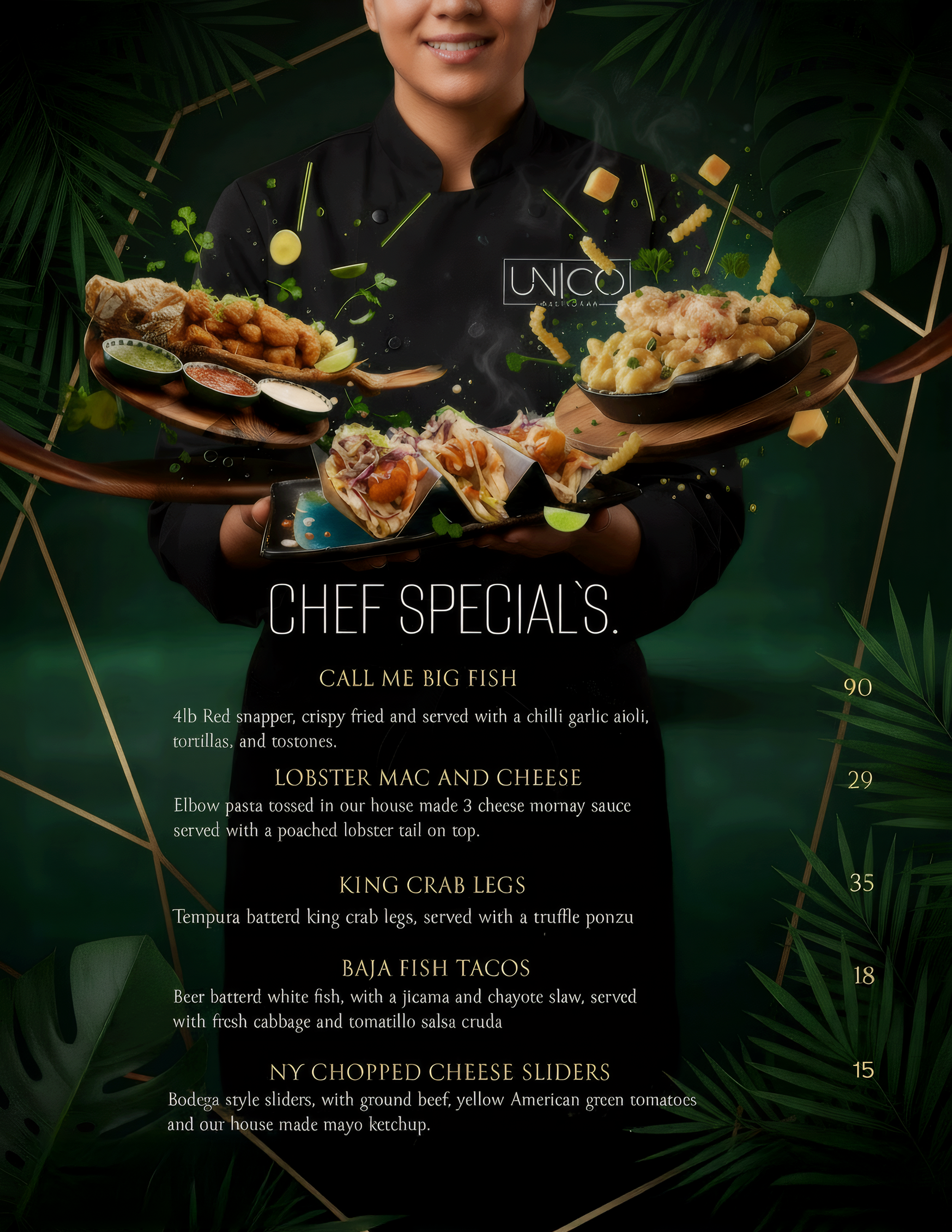 Restaurant menu with various dishes and prices, accompanied by images of tacos, a burger, and a shrimp dish on a black table with orange chairs.